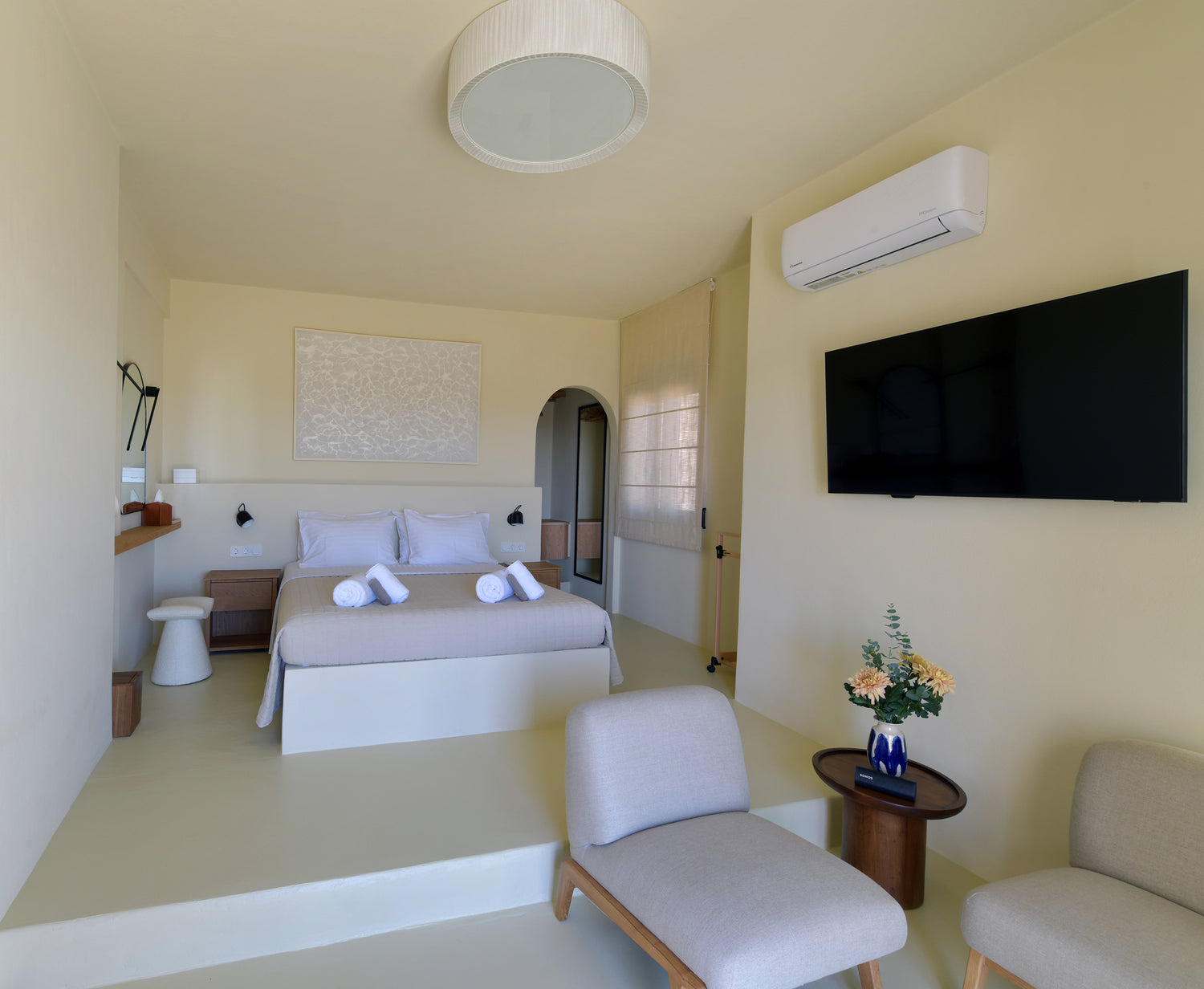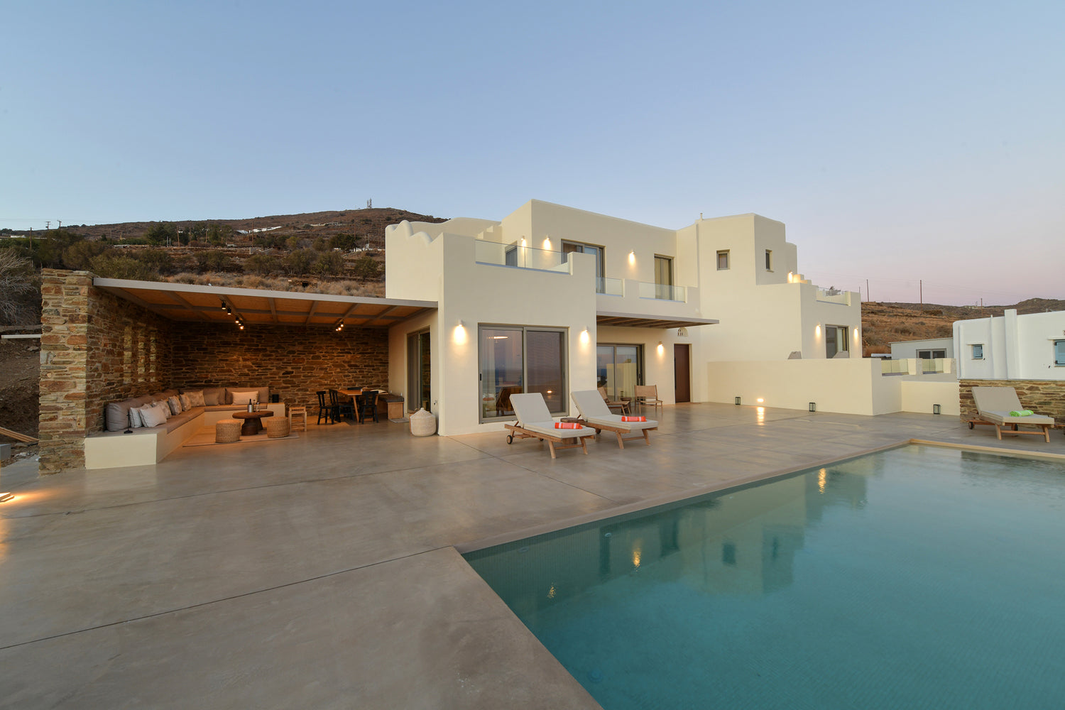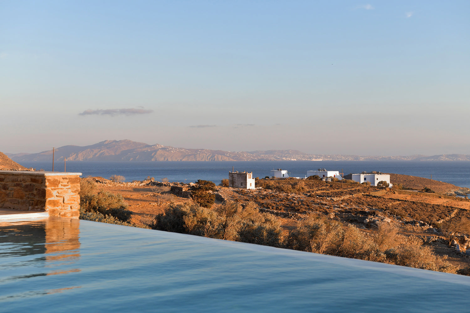 Step outside to a beautifully landscaped terrace surrounding the 9-meter private swimming pool. Guests can unwind on the luxurious sun loungers while taking in breathtaking views of the Aegean Sea and the iconic island of Mykonos. The outdoor area is completed with a shaded dining area beneath a pergola, perfect for alfresco dining.